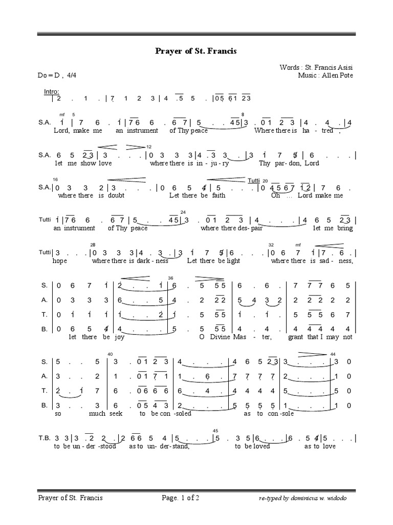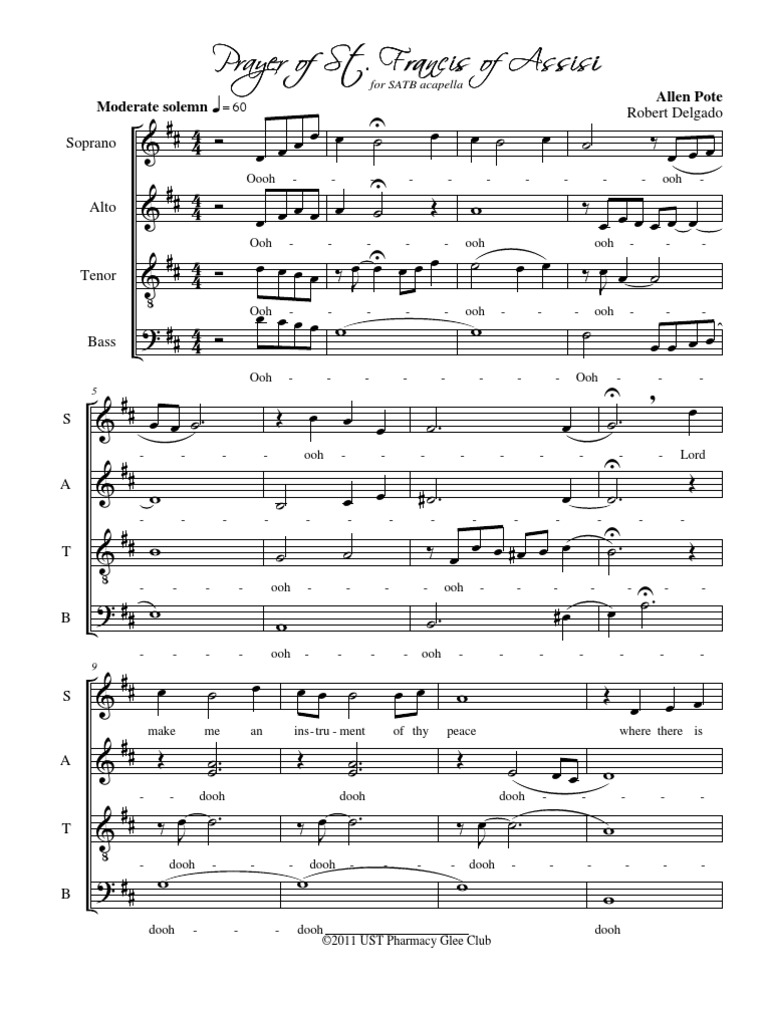 Prayer of st francis allen pote pdf Buy this item to display, print. Allen pote has skillfully set this lovely text with a warm, flowing melody that is sure to inspire a spirit of peace and unity. The life and prayers of saint francis of assisi, the life and prayers of saint francis of assisi, st. Allen pote do = d , 4/4 midi file; Oh lord, make me an instrument of thy peace. Francis (satb ) by allen pote/ | j.w. Francis (satb ) by allen pote/ at jwpepper.com. Written by allen pote arranged by robert delgado for satb cho Allen pote green lake singers. Ethan ibsen 2 corinthians 13:14.